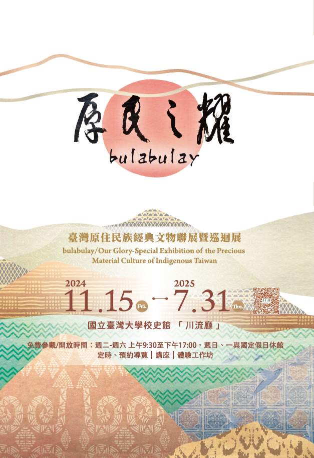 財團法人福祿文化基金會於國立臺灣大學校史館川流廳舉辦「bulabulay原民之耀-臺灣原住民族經典文物聯展登巡迴展」,旨在透過原民多樣化的傳統文物展現,傳遞原民文化廣袤與精緻的內涵,提升學生對原住民族文化與藝術的認識及重視,鼓勵貴校於下學期校外教學期間安排參觀,預約團體導覽。