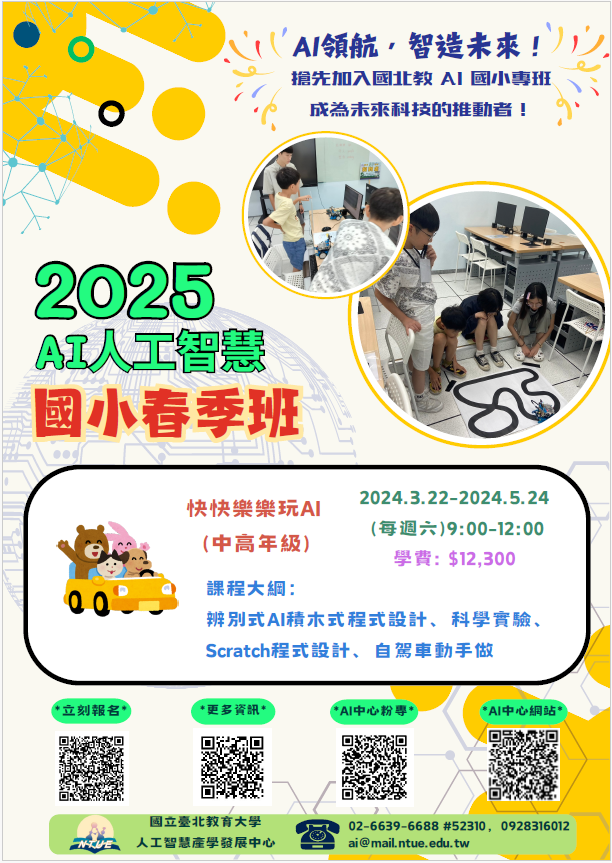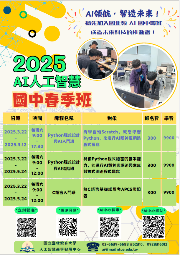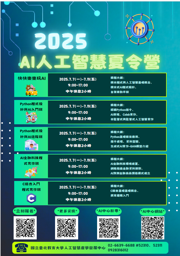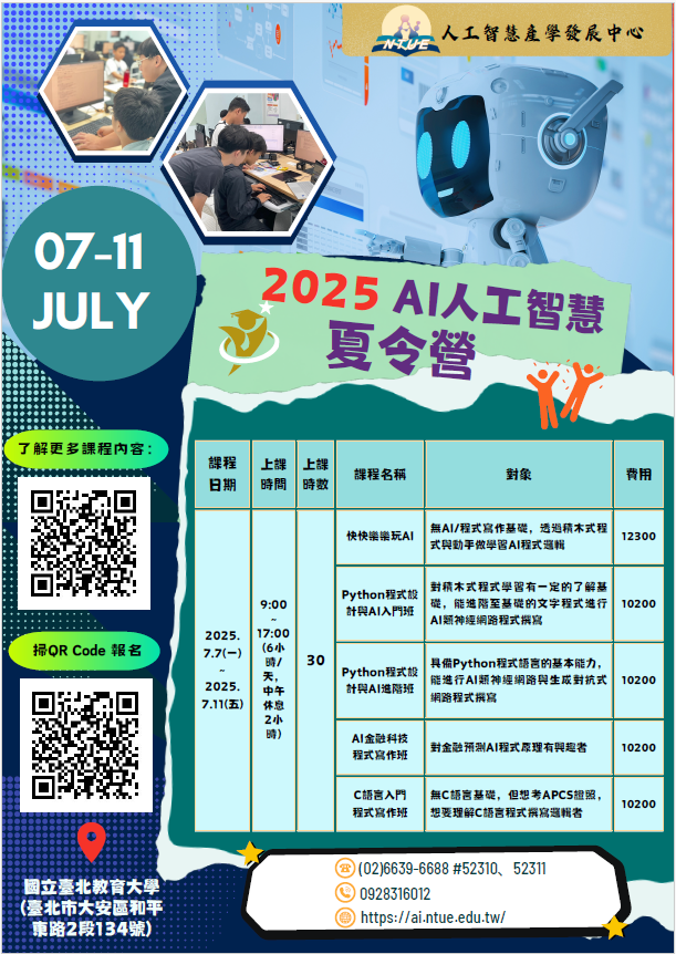主題營隊課程:「快快樂樂玩AI」、「Python程式設計與 AI入門班」、「Python程式設計與AI進階班」、「C語言入 門班」、「AI金融科技程式寫作班」等多梯次實體課程 。