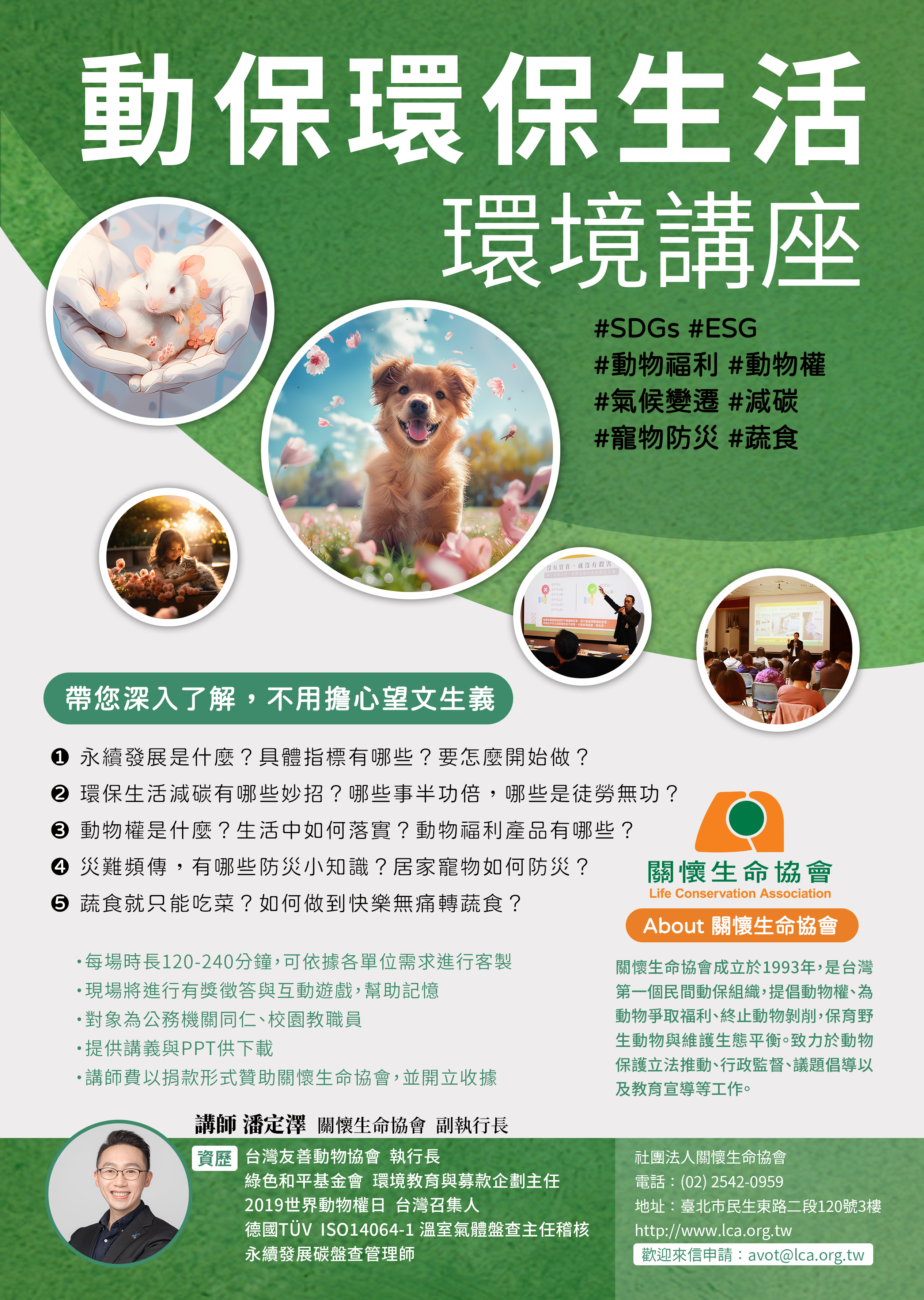 四、為因應前述各校教師之要求,以及學校師生對於動物保護 議題之高度興趣,本會除動保教師研習營外,特別設計「動保環保生活」講座,囊括SDGs、ESG永續發展、動物權 與動物福利、氣候變遷與減碳、寵物防災、蔬食等熱門主題,希望能夠豐富既有的環境教育課程,並由本會副執行長潘定澤(德國TÜV ISO14064-1溫室氣體盤查主任稽核與永續發展碳盤查管理師),主動赴各公私部門及學校宣講(請見附件文宣)。