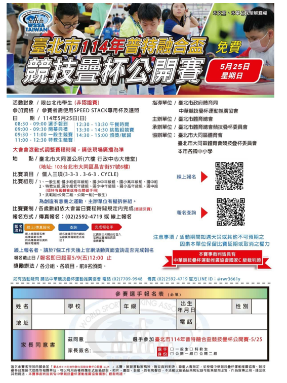 一、旨揭競賽對象係以身心障礙特教學生為主(享有平等參與運動的機會),目的則是藉由競技疊杯運動促進身心障礙學生左右腦的溝通,訓練手眼協調能力和反應時間,使其身心健康。但也有挑戰組(不區分國中、國小)特教班組、資源班組、一般生組(詳請參閱附件-競賽規程)。