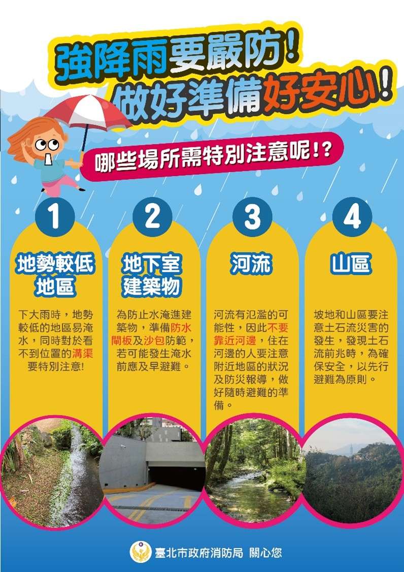 汛期將至,請提前清理下水道與排水溝,掌握氣象資訊。如至山區、河邊等地區,應提高警覺,注意環境變化,以保安全。