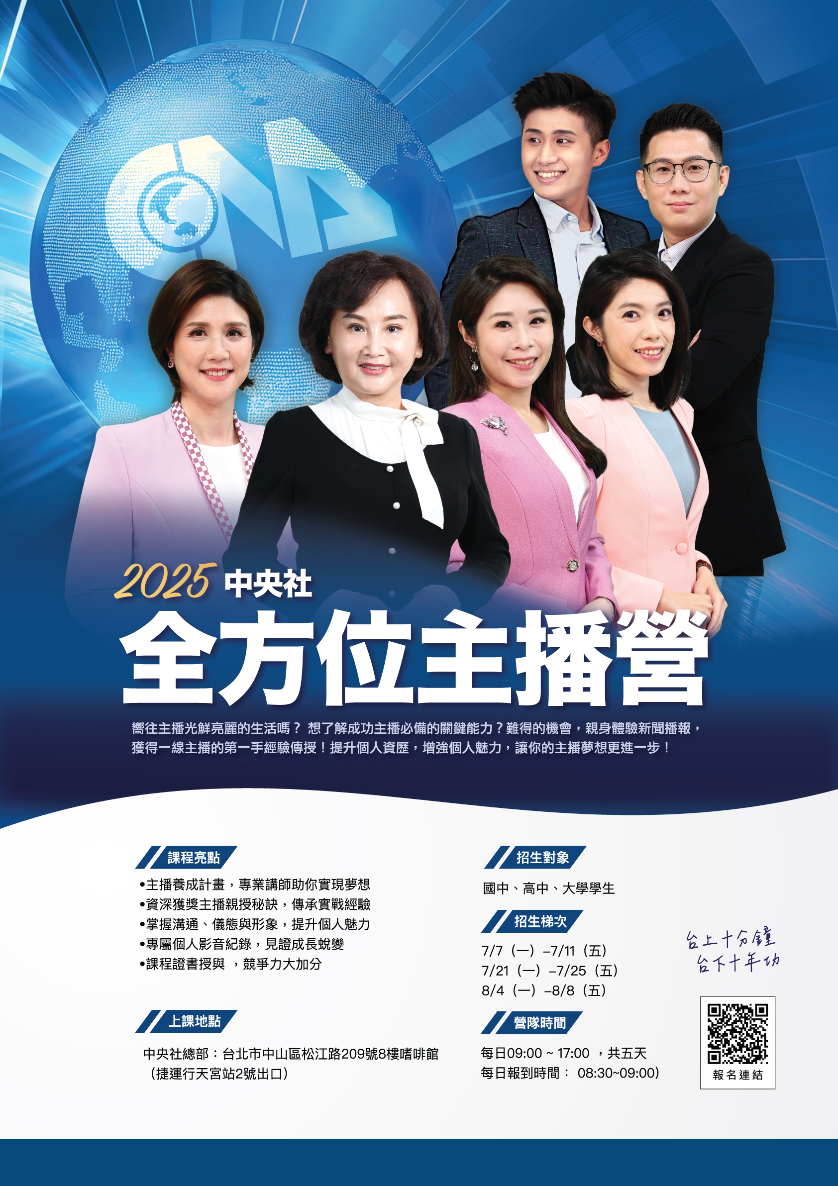 中央社將於2025年7、8月首次對外辦理全方位主播營及新聞 營,透過專業課程,讓參加者親身體驗新聞播報、了解新聞工作,進一步掌握溝通技巧、提升個人魅力。課程並有專屬影音紀錄及證書授與,為個人資歷加分。