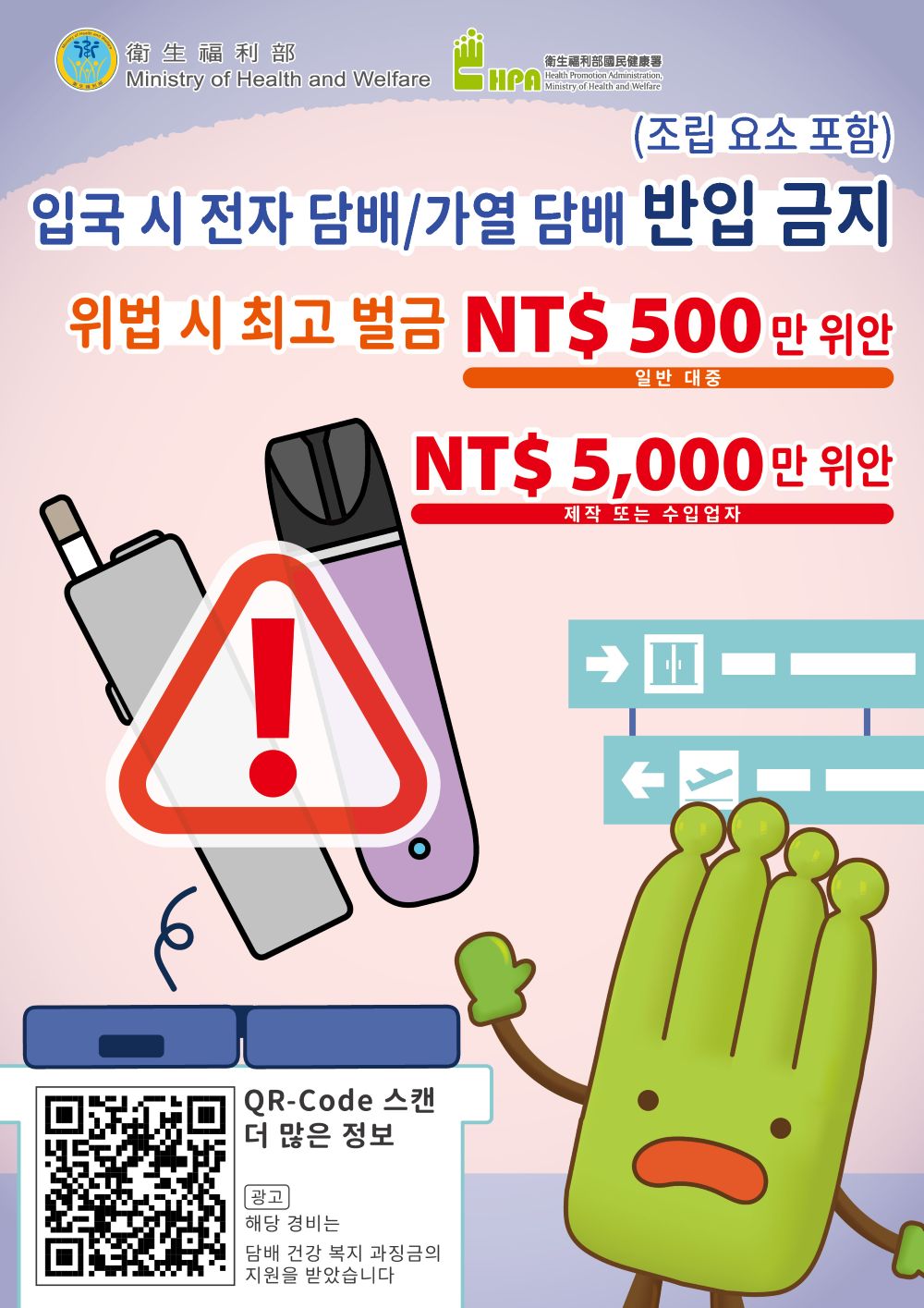 檢附衛生福利部製作「禁止攜帶電子煙或加熱菸入境」中、 英、日、韓文宣導單張(詳如附件1-4)供參