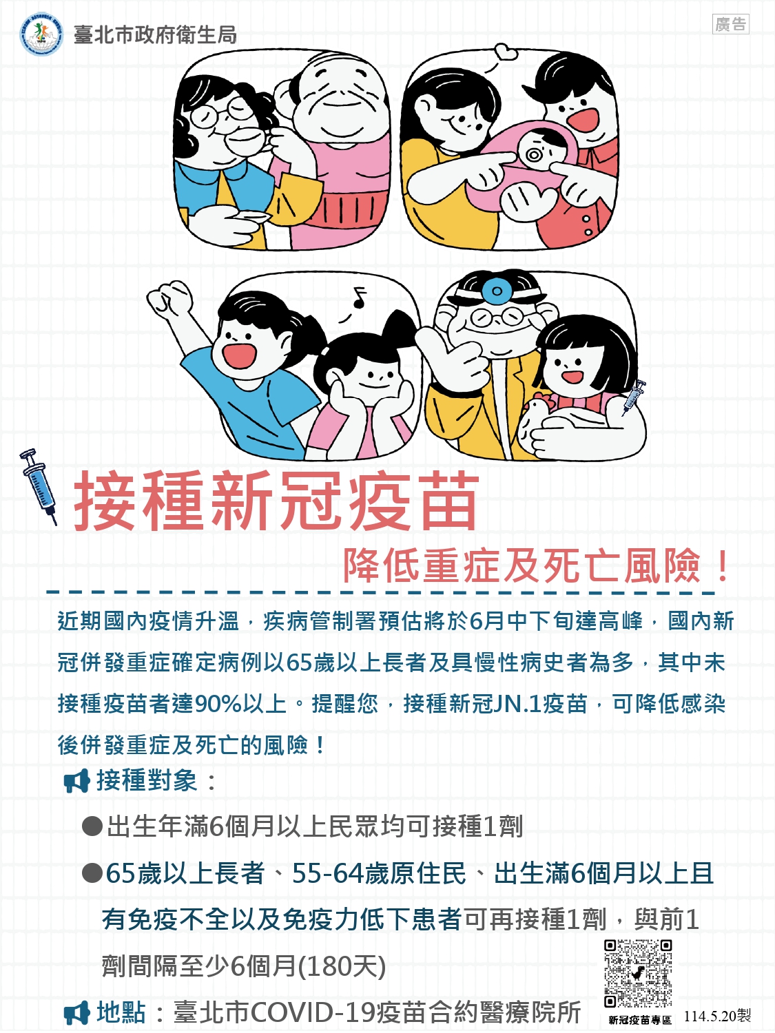 一、依據疾病管制署疫情監測資料,近期國內新冠肺炎疫情升溫,預估於6月中下旬達高峰,國內新冠併發重症確定病例以65歲以上長者、具慢性病史者為多,未接種疫苗者達90%以上,顯示長者為感染新冠肺炎併發重症及死亡之高風險族群。因應疫情升溫,接種新冠JN.1疫苗是預防新冠肺炎重症最有效的方法,尚未接種者應儘速接種。