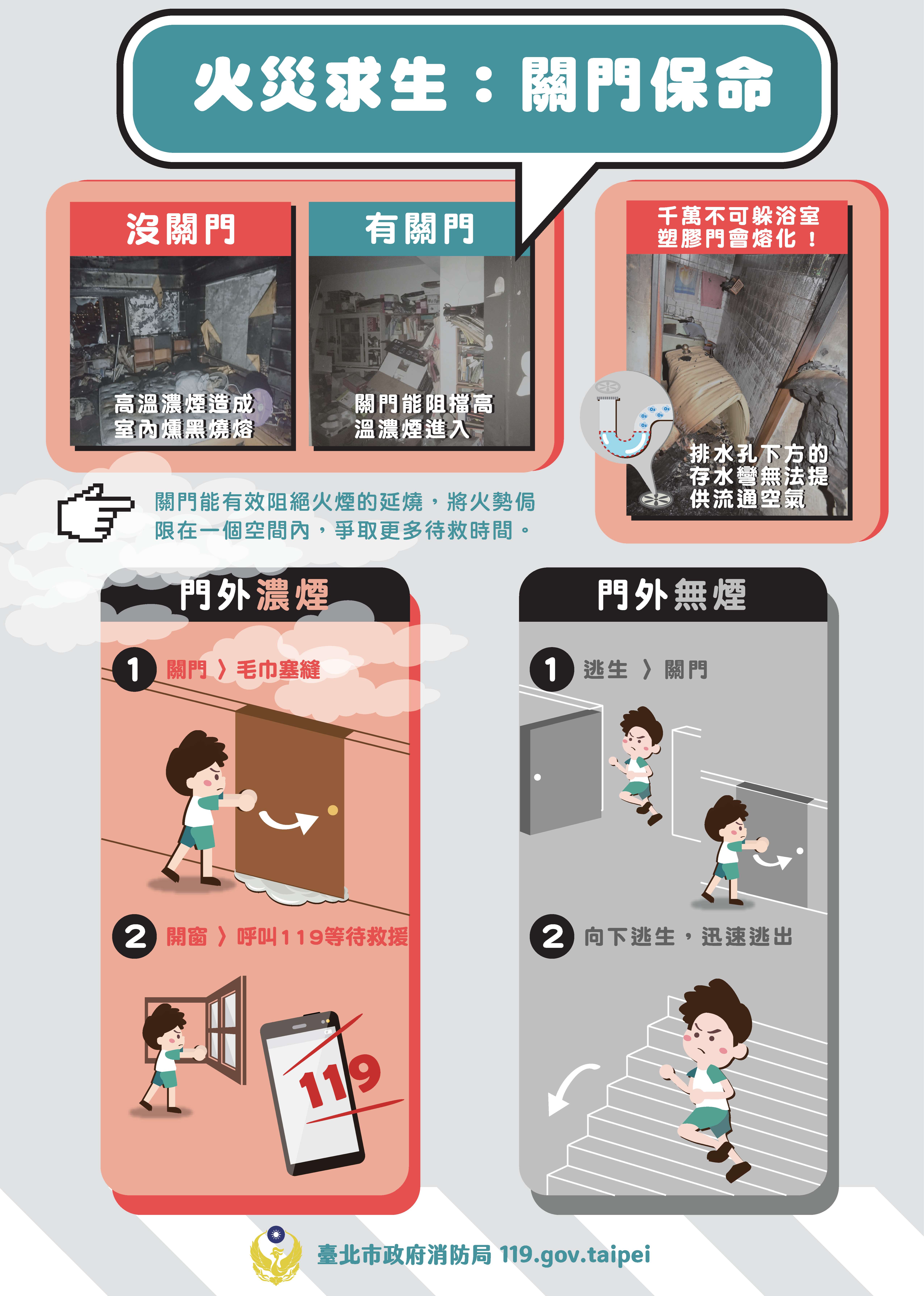 以防止火勢及煙霧侵入,尋找安全空間就地避難,並立即撥打119