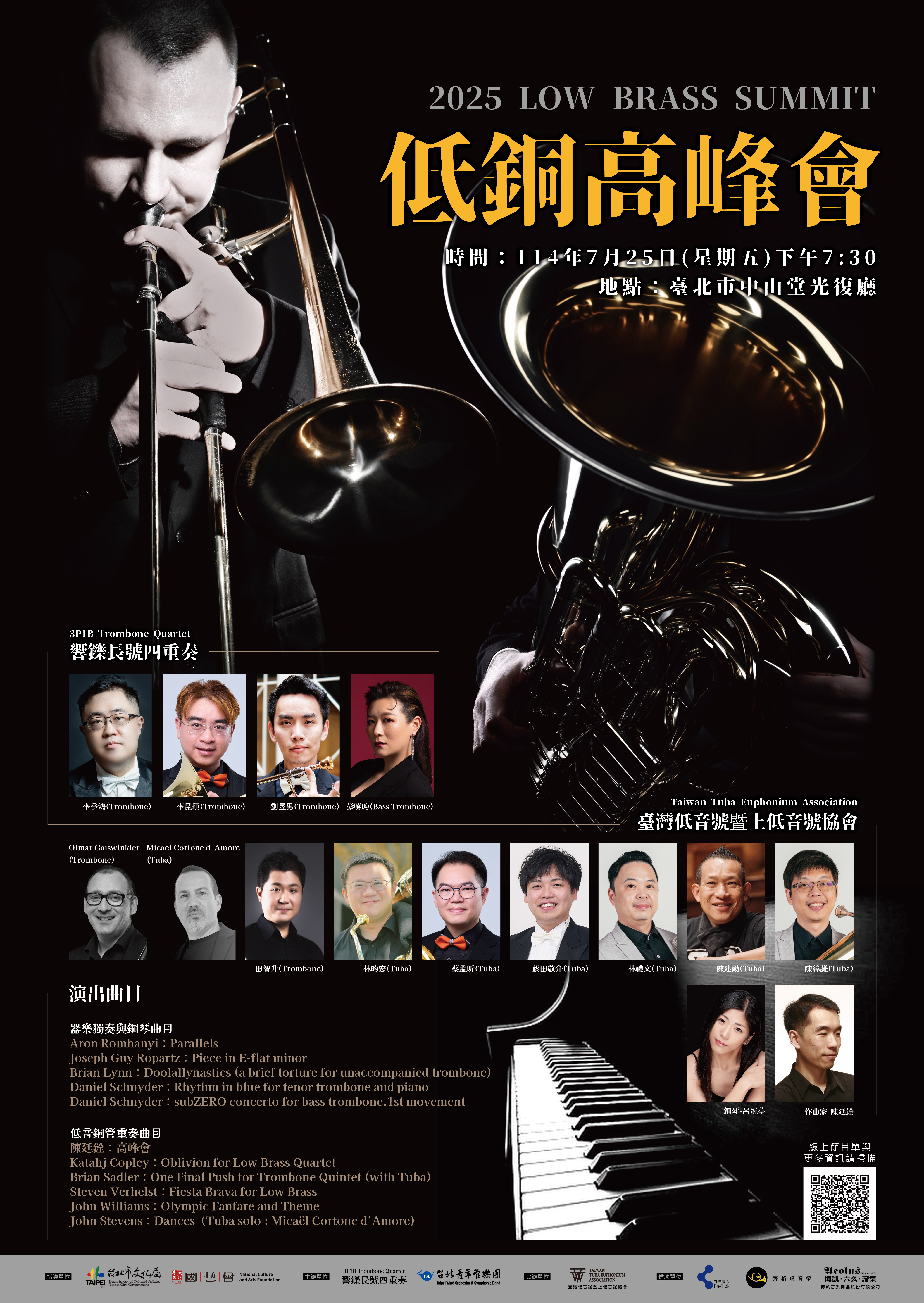 由臺灣職業樂團長號首席與國家交響樂團低音長號彭曉昀老師組成的響鑠長號四重奏,將帶來一連串精彩萬分的長 號獨奏與重奏曲目。更邀請國內外低音號演奏名家一同參與,是一場不可錯過,精彩萬分的低銅音樂饗宴