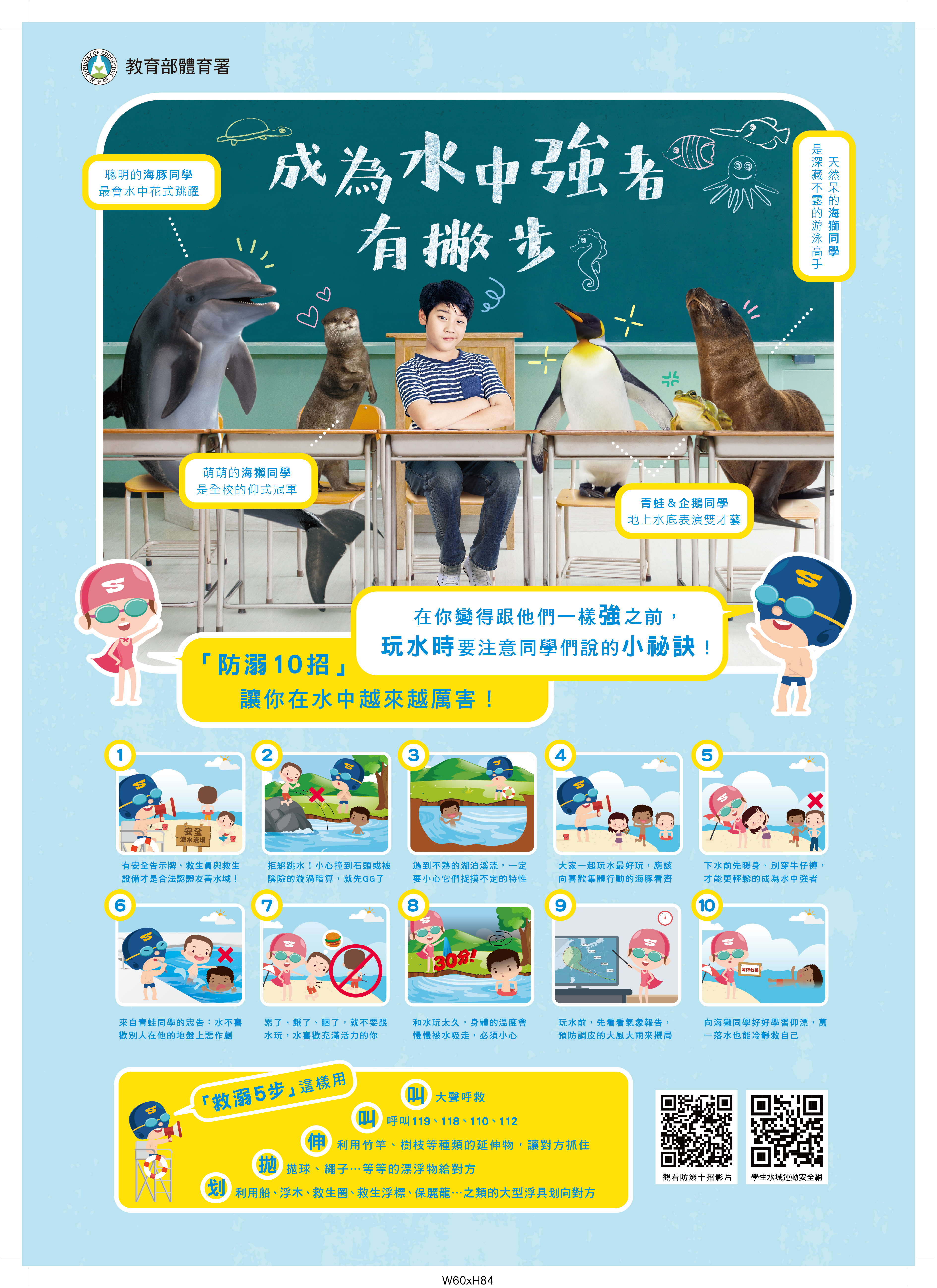 (一)體育署製作「救溺特攻隊」、「決定命運4招」、「新版防溺10招」、「自救救人-溪河流篇」等水域安全宣導短片與「救溺5步、防溺10招」海報檔案,請至詳如相關連結1下載。