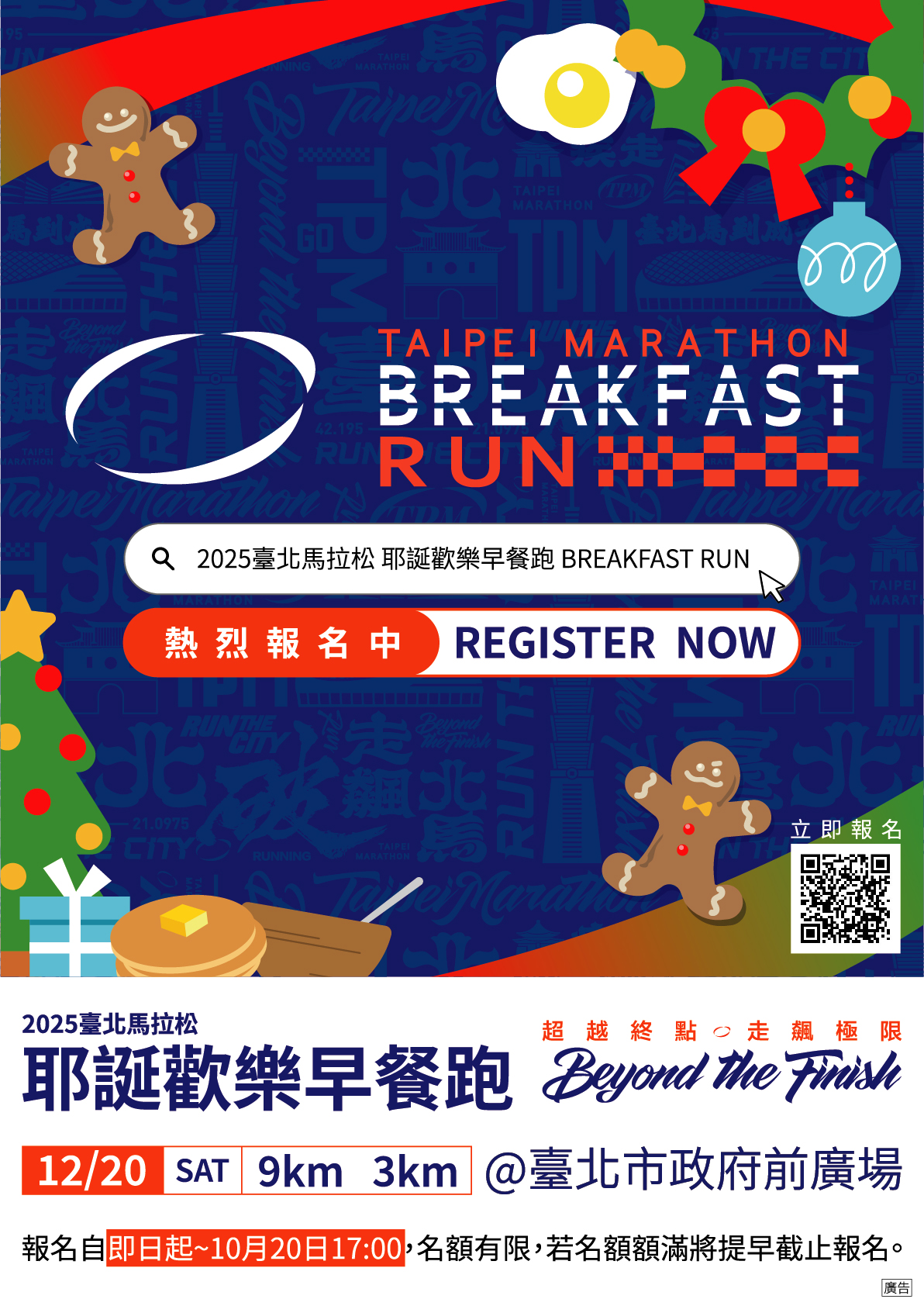 一、臺北馬拉松由本府、中華民國田徑協會及中華民國路跑協會共同主辦,本局承辦,為本府年度重要大型活動。於正式賽前1日114年12月20日(星期六)假本府市民廣場(起終點)辦理歡樂早餐跑,適合親子參與、初階跑者及學生族群等參加,詳細資訊如下: