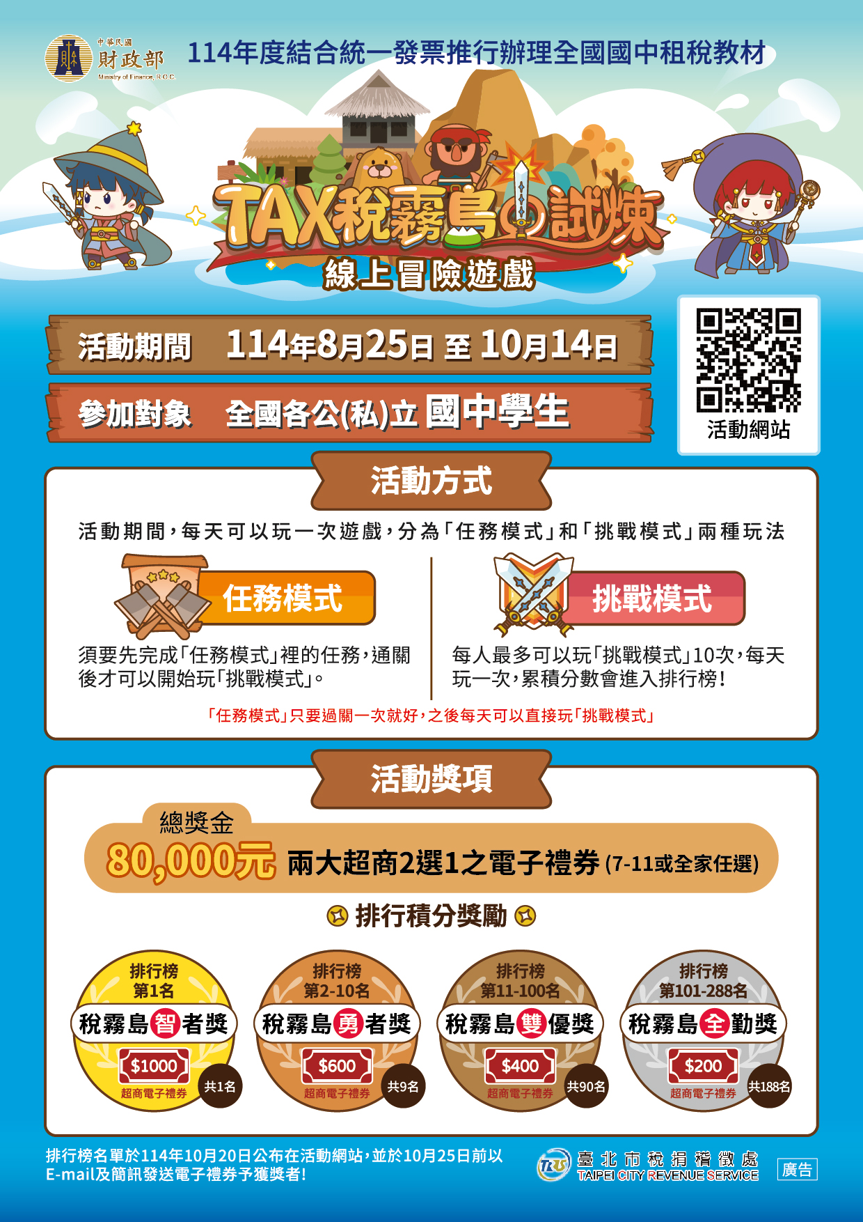 (三)內容:分為「任務模式」與「挑戰模式」兩種玩法,活 動詳情請上活動網站(https://www.gotax.tw/tax2025 /)或「北市稅處」粉絲專頁(https://www.facebook. com/tpctax/?locale=zh_TW)查詢。
