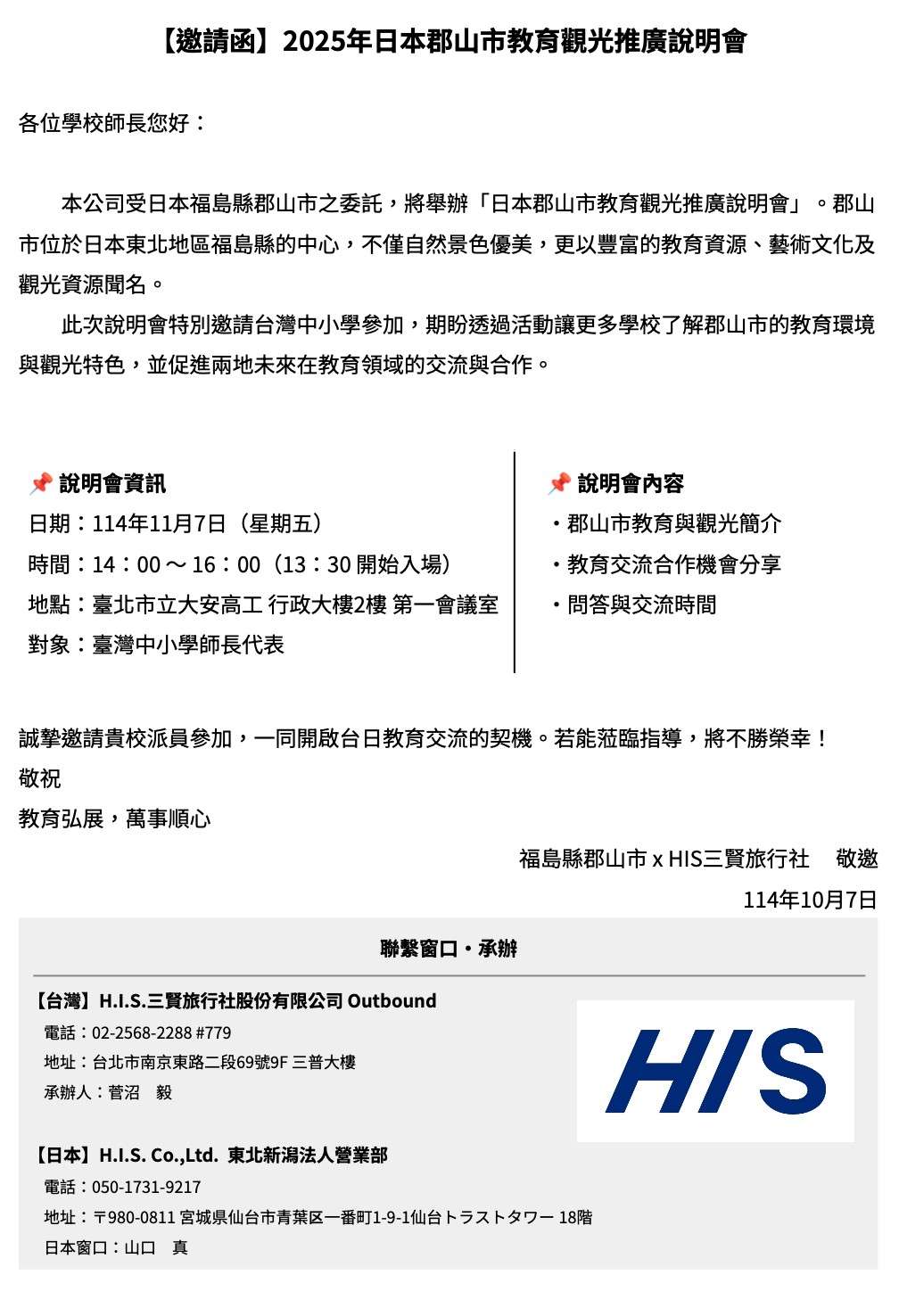 一、依據福島縣郡山市觀光政策課114年10月8日邀請函辦理(請參閱附件)。