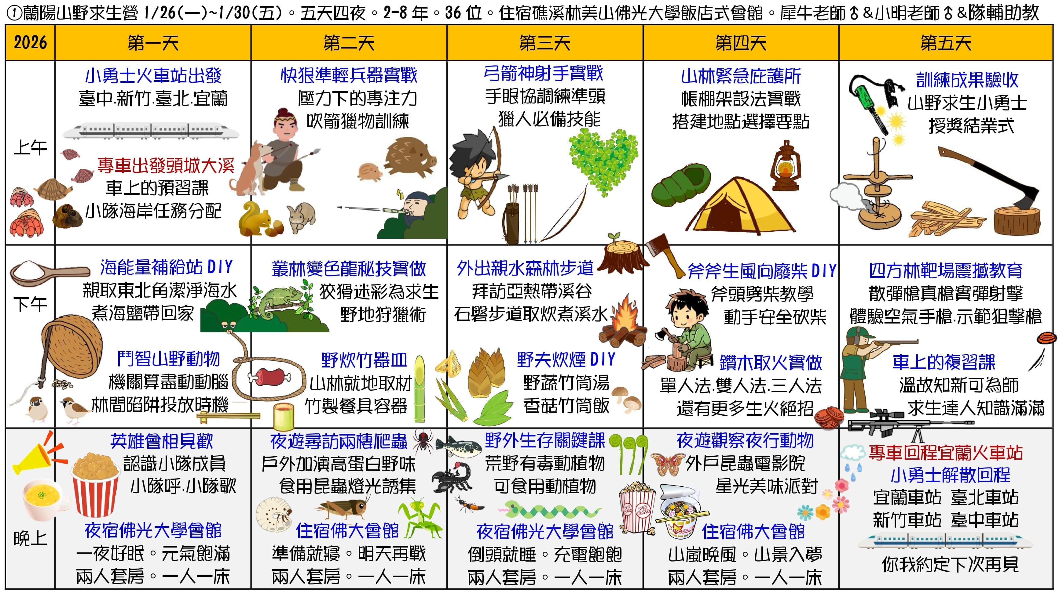 二、課程主題:①蘭陽山野求生營(5天4夜)、②小琉球海龜營(5天4夜)、③宜蘭生態農場營(3天2夜)、④TPE博物館生態營(3天外出不過夜)、⑤屏東柚園攀樹營(3天外出不過夜)、⑥節肢小怪獸營(3天大學不過夜)、⑦池上單車生態營(4天3夜)。