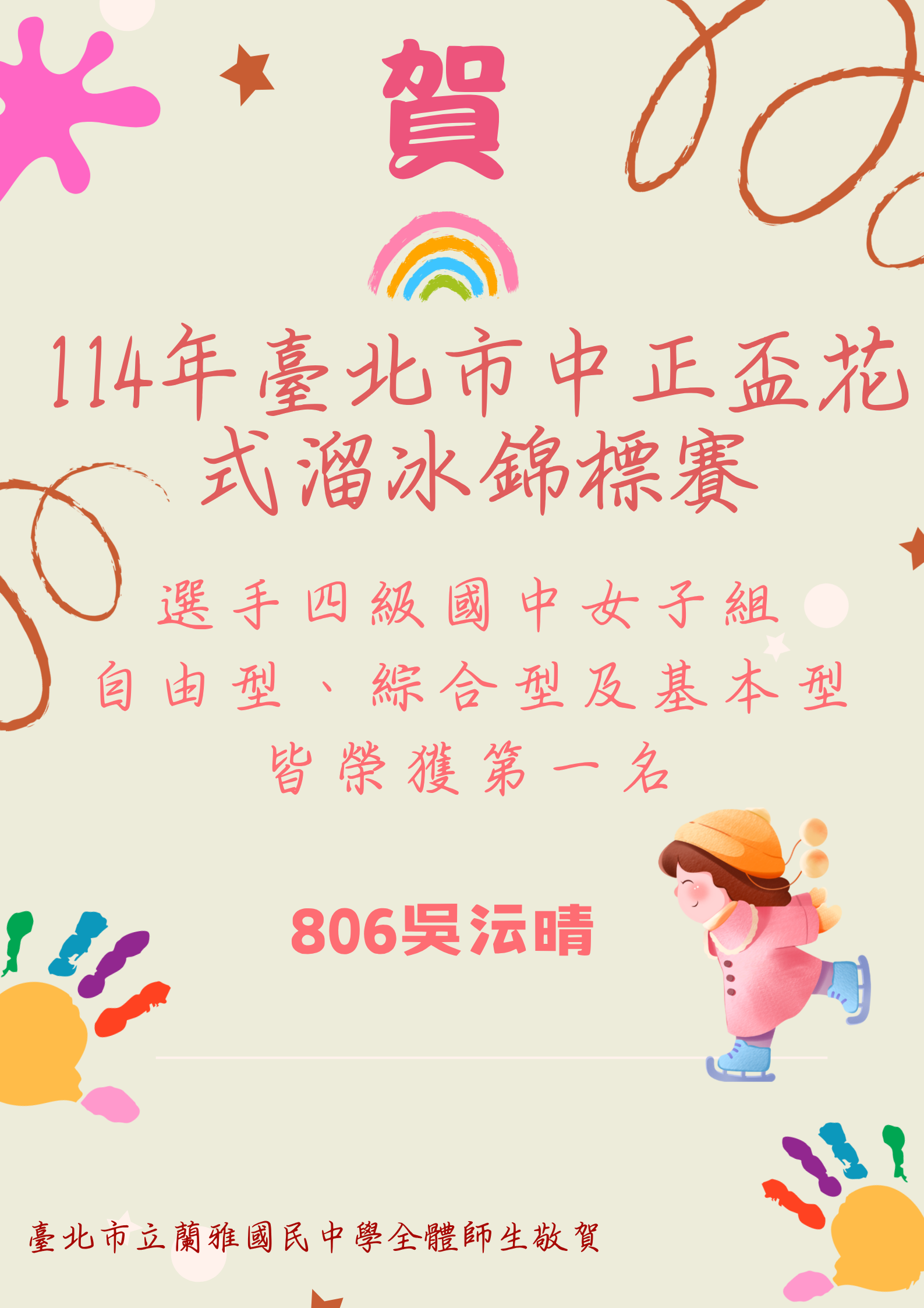 賀!本校學生806吳沄晴參加【114年臺北市中正盃花式溜冰錦標賽】表現優異!~感謝806李孟珊老師的指導~~