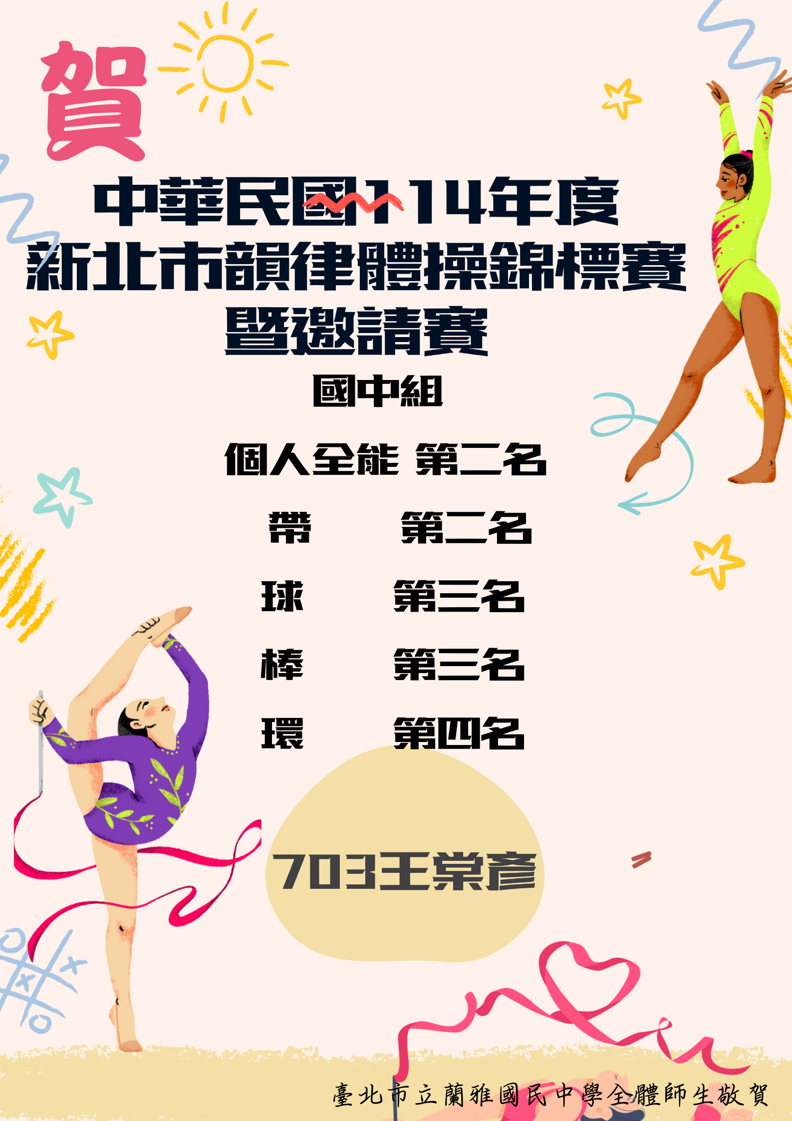 賀!本校學生703王棠彥參加【中華民國114年度新北市韻律體操錦標賽暨邀請賽】表現優異!~感謝彭怡菁教練的指導~~