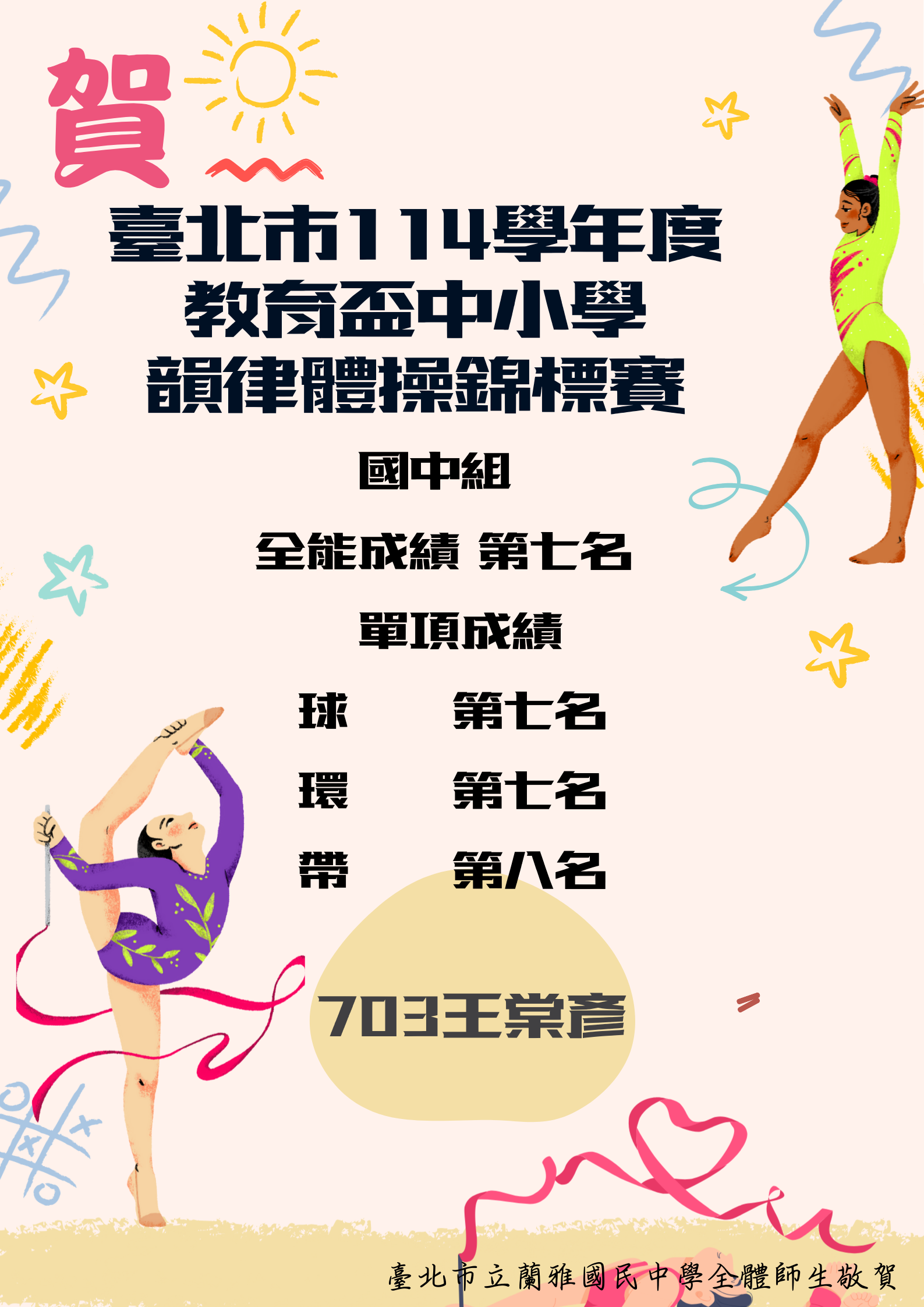 賀!本校學生703王棠彥參加【臺北市114學年度教育盃中小學韻律體操錦標賽】表現優異!~感謝彭怡菁教練的指導~~