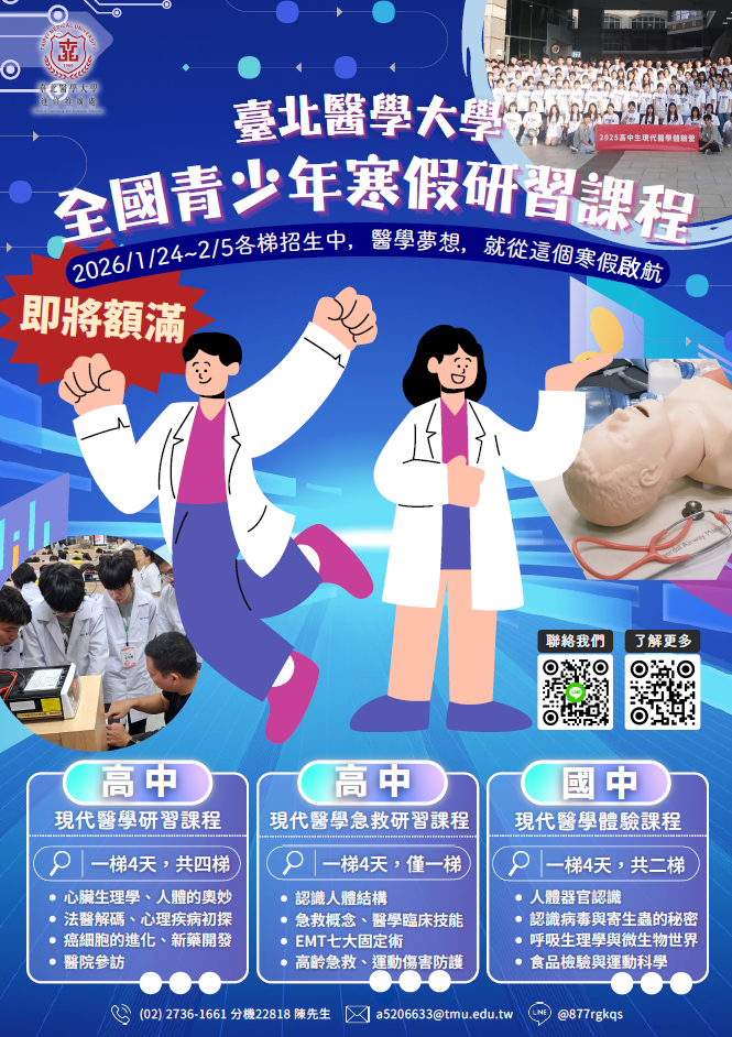 為鼓勵國中學子於寒假期間參與多元學習,將於115年1月17日至2月5日辦理【全國青少年國中寒假研習課程】系 列活動。課程仍持續開放報名中,名額有限,請欲參加者把握機會,亦請協助公告並轉知學生及家長周知。