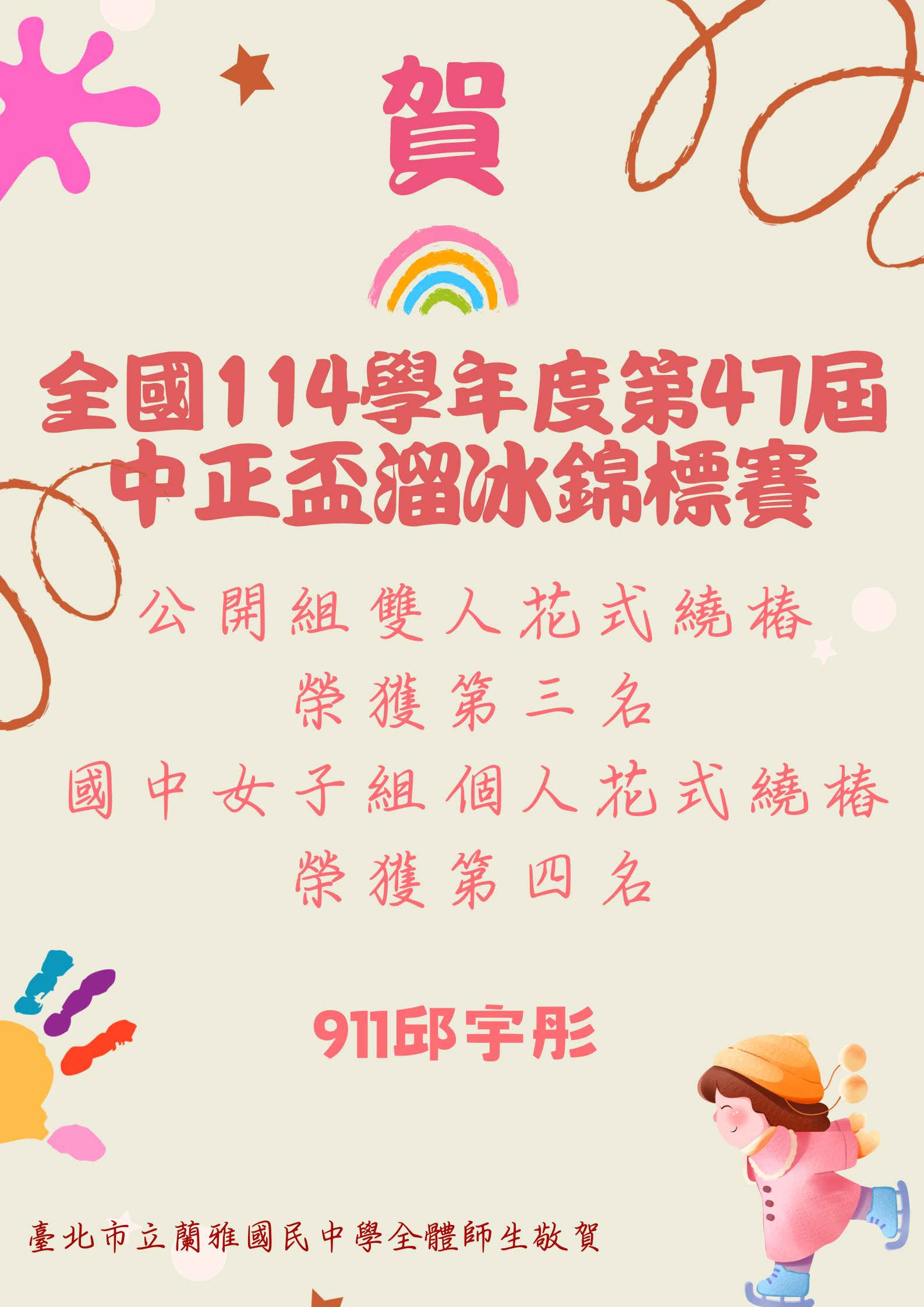 賀!本校學生參加【全國114學年度第47屆中正盃溜冰錦標賽】表現優異!~感謝鄭夙君老師及徐兆逸老師的指導~~