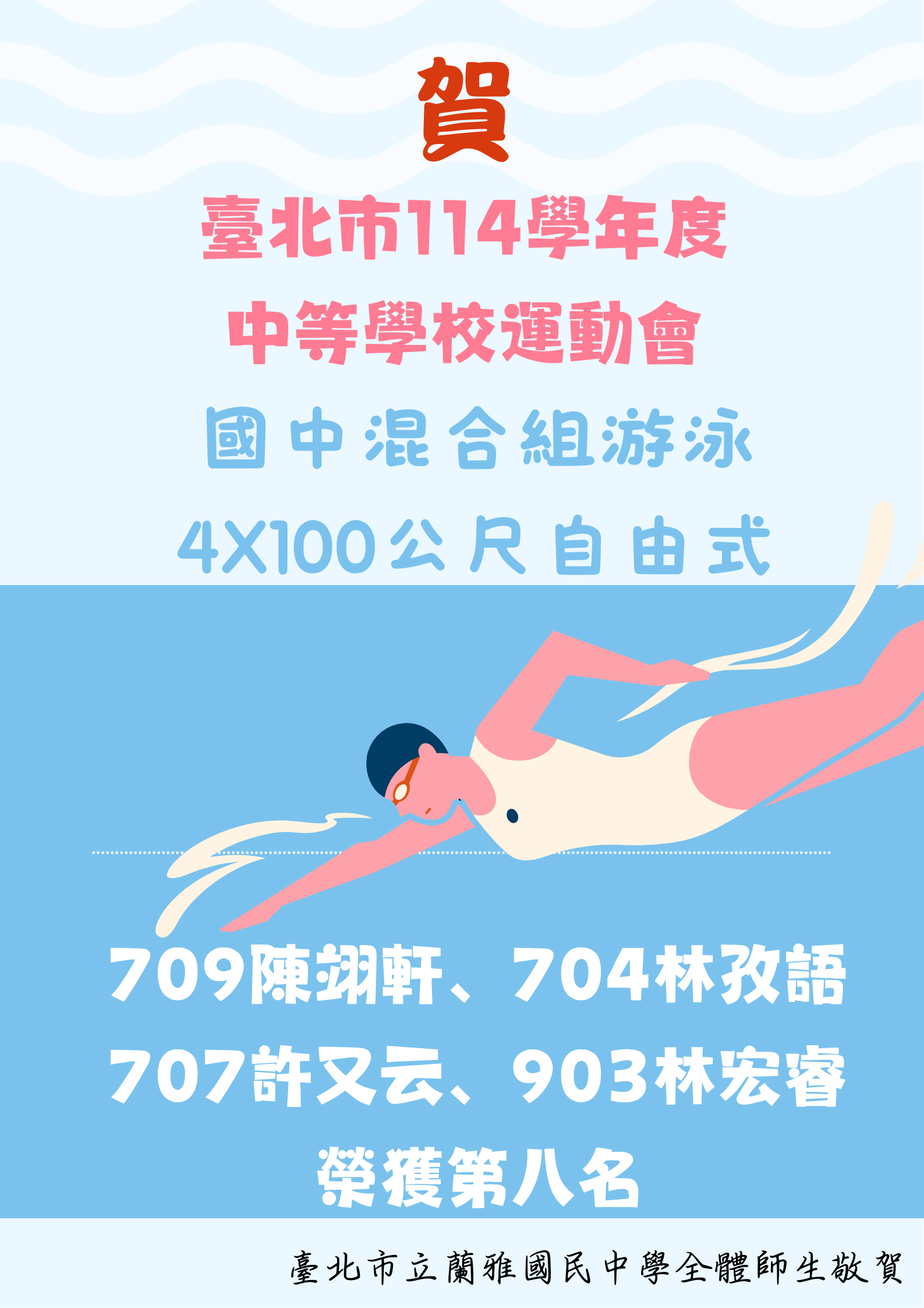 參加臺北市114學年度中等學校運動會國中混合組游泳4X100公尺自由式榮獲第八名