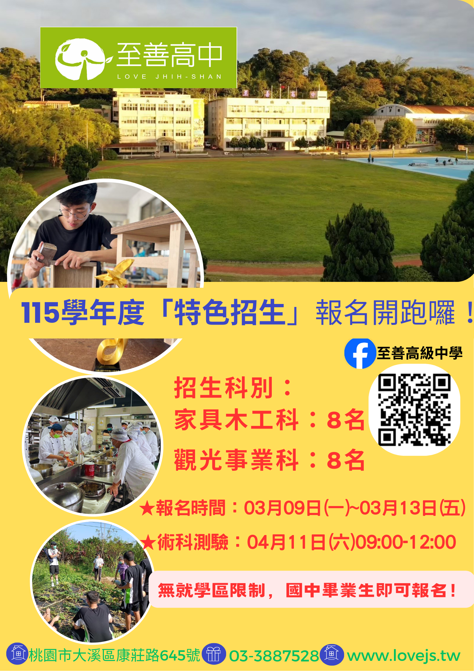 六、術科測驗地點:至善高中 (桃園市大溪區康莊路645號)。