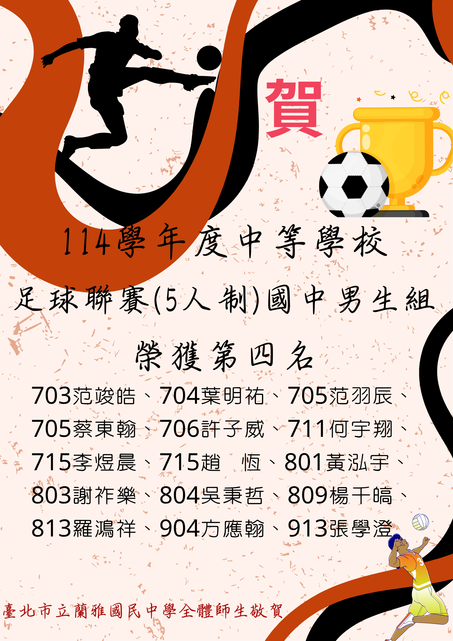 賀!本校足球隊榮獲114學年度中等學校足球聯賽(5人制)國中男生組第四名!感謝王吉成教練的指導~~
